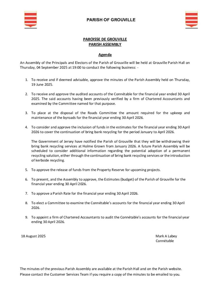Parish Rates Assembly on Thursday, 04 September 2025 at 19:00
